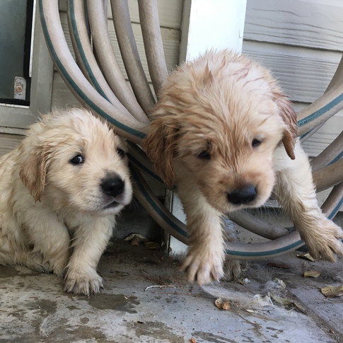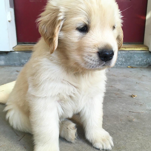 This little munchkin is full of bounce. She runs, plays, and bounces-bounces-bounces all about the yard, always seeking a new friend and a new adventure. Like Miss Yellow, she loves to "play" with the big dogs. She is also the darkest shade of gold in this litter.